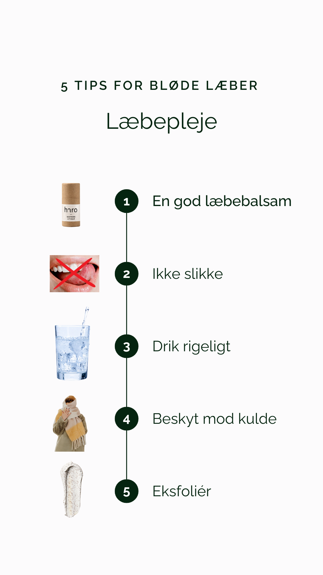 Hav altid en god og naturlig læbebalsam ved hånden og smør læberne ofte.